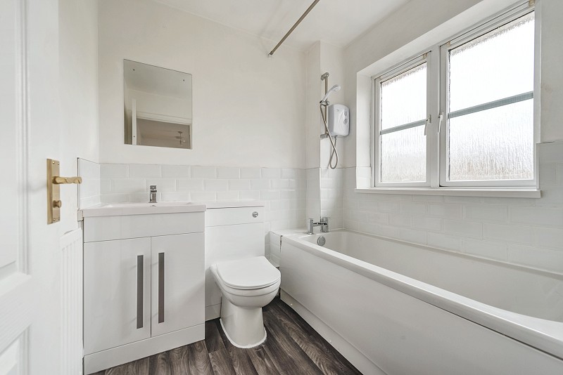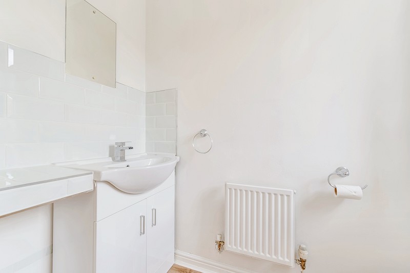 Painted walls, painted ceiling, wood effect vinyl flooring, pvc double glazed window with frosted glass to front aspect, radiator, low level wc, tiled splash back to sink area, wash and hand basin set on a vanity unit.