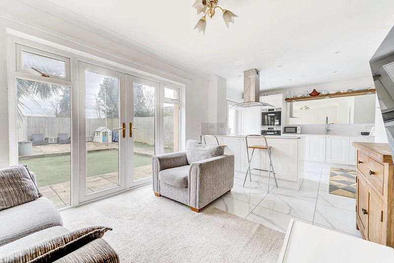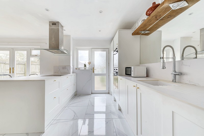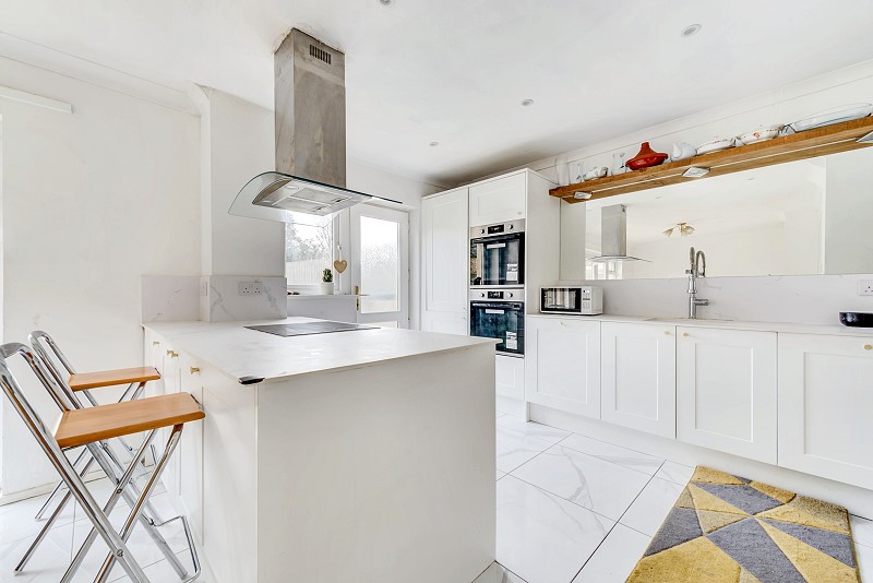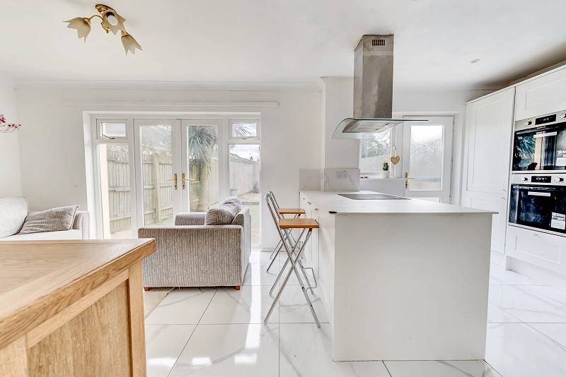 Fitted with range of wall and base units, electric hob set upon complimentary work surfaces, fitted double oven, bin store fitted within drawer, integrated dishwasher, ceramic sink fitted within work surface, space for large fridge/freezer, door leading to rear garden and window looking to rear aspect.