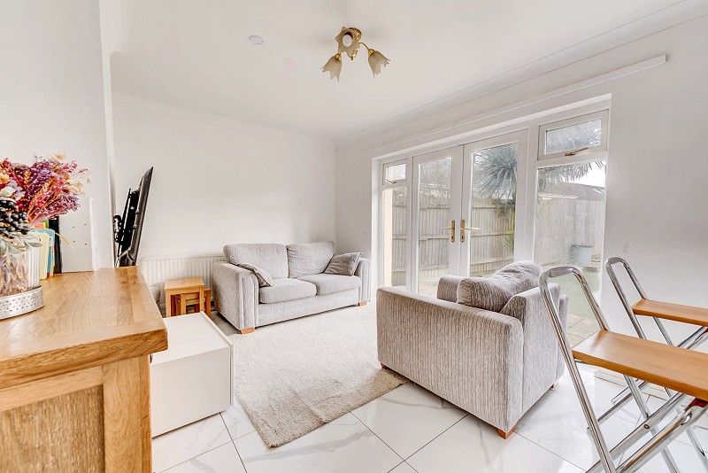 PVC french doors with 2 glazed side panels, painted walls, and ceiling with coving, tiled flooring, radiator x2.