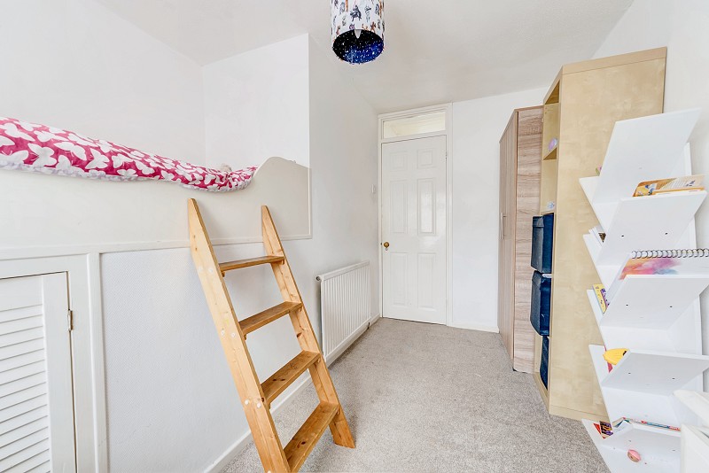 Window to front aspect, carpet flooring, painted walls, textured ceiling, radiator, fitted cabin bed with storage.