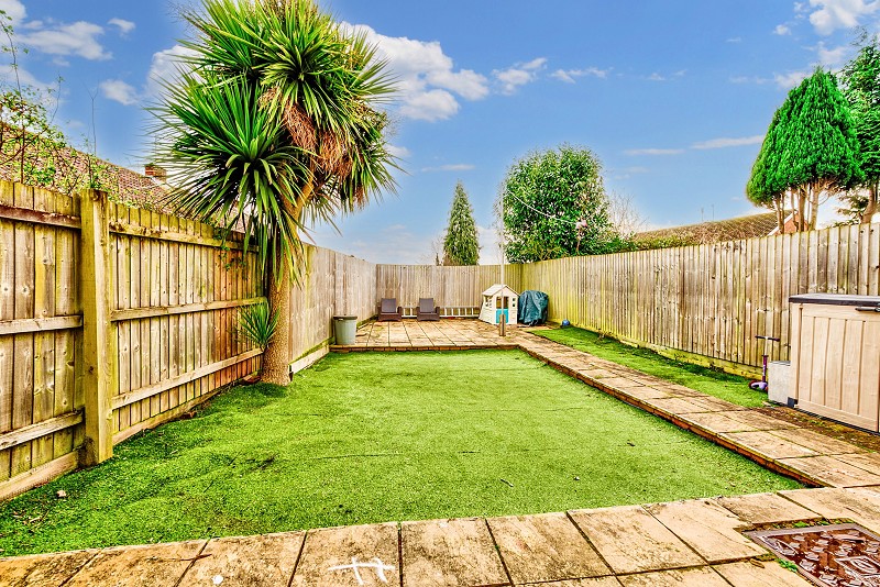 Enclosed rear garden with artificial grass with pathway leading to paved patio at rear of the garden, fenced boundaries.