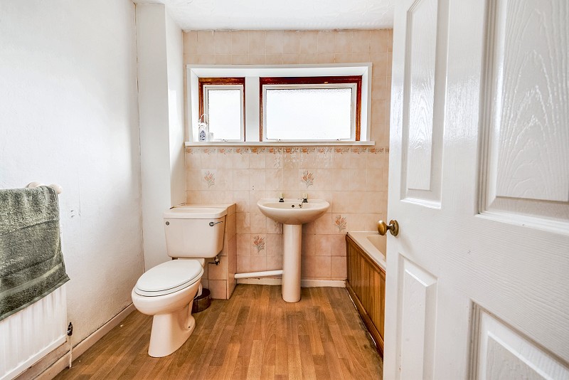 Window to rear aspect, range of textured and tiled walls, close couple WC, pedestal wash and basin, panelled fitted bath with electric wall mounted shower, vinyl flooring, radiator.